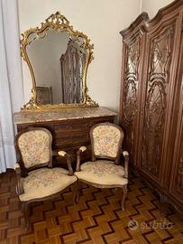 Vendo camera da letto completa in autentico stile Barocco Piemontese, realizzata negli anni ’70 da artigiani locali. Legno massello finemente intagliato (probabile noce), con dettagli e lavorazioni di grande pregio. Il set comprende: