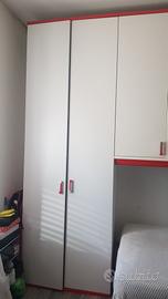 la camera è composta da armadio, due letti, scalette per accedere al letto a castello con comodissimi cassetti contenitori, materasso da una piazza e mezza, comodino ed in più scrivania a forma di mezza luna con sedia rossa.