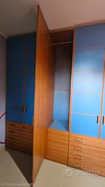 Vendesi intera camera composta da armadio, scrivania, comodino , sedia. l' armadio ha 5 ante e 8 cassetti, set di mensole sul lato destro, come da foto . totale lungrezza armadio 2,90 . perfettamente rifinito e internamente con mensole e aste appendiabiti. scrivania abbinata dimensioni lunghezza 145 langhezza 58 cm.