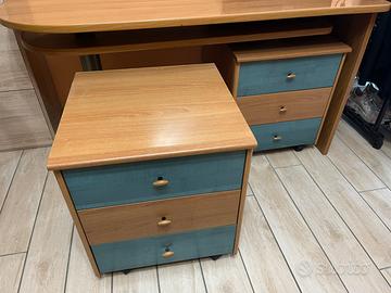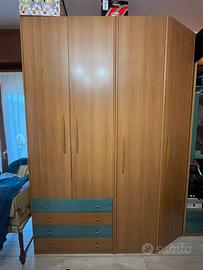 Armadio 4 ante, scrivania, comodino e letto singolo in ferro battuto, con doghe in legno e materasso. Prezzo trattabile.