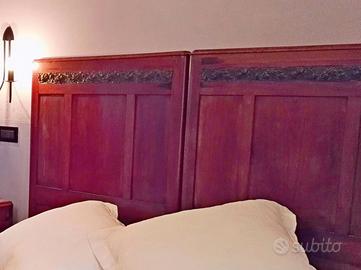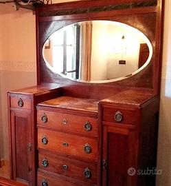 Bella camera completa, stile impero. In mogano tendente al rosso. Il comò ed i comodini hanno la copertura in marmo rosa, senza rotture. Nella testiera, nella parte superiore dell'armadio e del comò è incastrata una bordura di rame con un susseguirsi di roselline in bassorilievo. Due bellissimi specchi ovali completano uno il comò e l'altro l'armadio. Il comò ha maniglie a battente di rame lavorato.