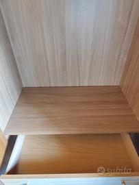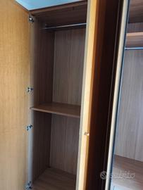 5 Ante, in legno chiaro con venature naturali (no i moderni in compensato, questo è legno vero!) 50cm ogni anta doppia + 64 cm la singola, non scomponibile. Completo di bastoni in acciaio, comodi ripiani e 3 cassetti. Chiusure funzionanti e cassetti perfetti. Era utilizzato per riporre il cambio armadio. No muffa, no odori strani. Si vende montato per mostrarvi lo stato effettivo. Possiamo aiutare nello smontaggio e nel caricarlo in macchina.