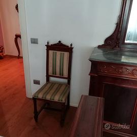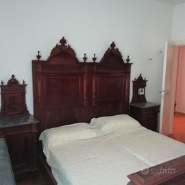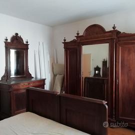 Camera da letto in legno massello, intarsiata, completa di: letto, armadio, comò, comodini, 2 sedie, in perfetto stato d'uso, databile fino 800 inizio 900.