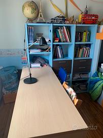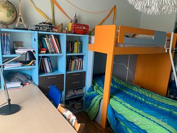 Vendo camera completa di armadio 4 ante a battente sagomate 180x229x60, letto a soppalco con secondo letto su ruote x materassi da 90x190, con reti ortopediche,comodino con due cassetti da 60 cm. ,scrivania 60x190 collegata a boiserie componibile a pannelli 5 mt. lineari h. 95 cm, llibreria bifacciale 145x 160 progonda 33cm. Marca Nardi.