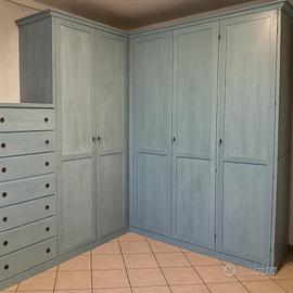 Vendo camera completa in legno massiccio, realizzata su misura e rifinita con una splendida finitura azzurro decapè (vedi dettaglio maniglia in foto), che mette in risalto le venature naturali del legno e dona un aspetto elegante, luminoso e moderno.