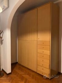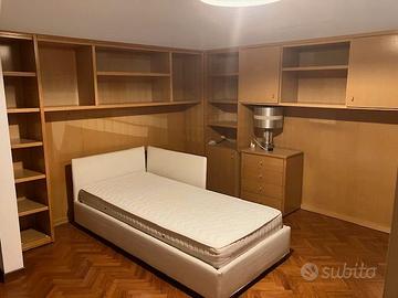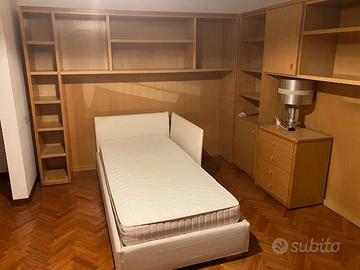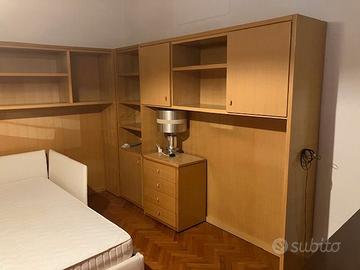 camera completa con mobili a ripiani , cassettiera , armadio e letto .
