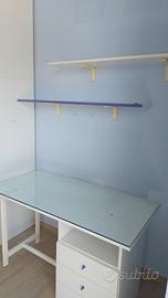 Armadio a 10 ante più due cassetti. Scrivania con appoggio in cristallo. Due mensole. Letto completo di rete con doghe anatomiche e materasso ortopedico. CAassettiera giorno con cassetti. Ritiro e smontaggio a Vs cura