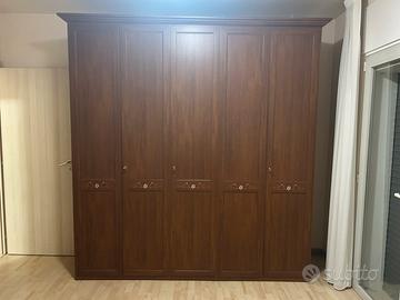 Camera completa: materasso piazza e mezza memory form, scheletro del letto rialzabile dalla parte della testa e dalla parte dei piedi, armadio, comodini, mobile con specchio,