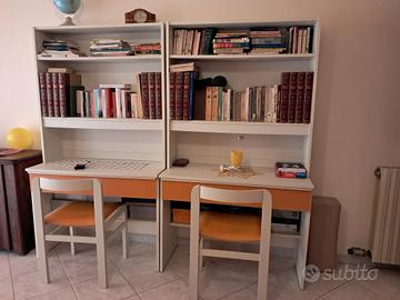 Camera ragazzi/e biaco/arancione con 2 letti singoli, 2 armadi , 2 scrivanie, 2 comodini, completa di 2 pouf, lampadario e tende coordinate. Scrivanie L 100 H 178 P 46 Letti L 90 H 80 lungh 197 Armadi L 155 P 59 H 268