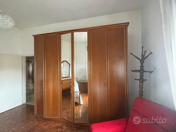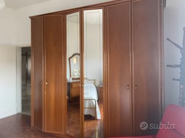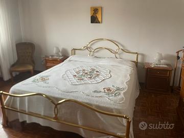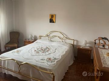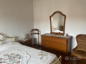 Camera colpleta con mobile cassettiera in noce nazionale 4 cassetti lunghezza 130x54 x82h con specchio ,comodinicoppia 55x 40 58h con tre cassetti , armadio 4 stagioni 6 ante 2,80 lunghezza, altrzza 2.50 profondità 60 con specchi interi e cassettiera interna Letto in ottone Liparini con rete in doghe +poltroncine in velluto stile luigi xv