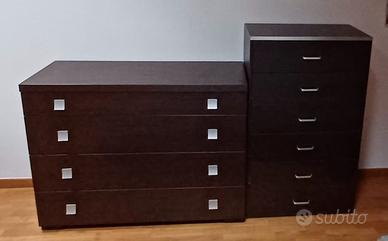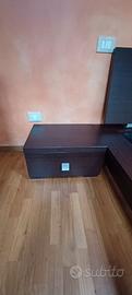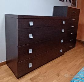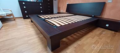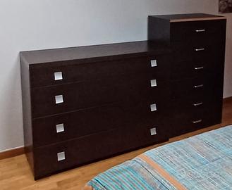 Camera da letto moderna, colore Wengè, composta da struttura letto completa di reti con doghe in legno, 226 x 199 x 20, due comodini 54 x 40 x 30, mobile cassettiera grande 116 x 46 x 89 e mobile cassettiera alto 68 x 40 x 113 . Possibilità di vendere i pezzi separatamente