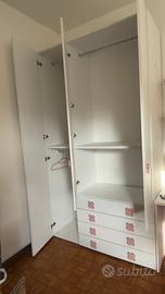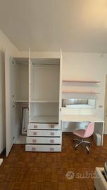 Tutto il necessario per una cameretta bellissima e funzionale: ✨ Letto Contenitore imbottito (materasso incluso) ✨ Armadio grande 3 ante + 4 cassetti ✨ Scrivania con specchio e mensole ✨ Sedia rosa girevole ✨ Comodino coordinato