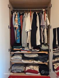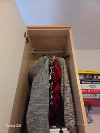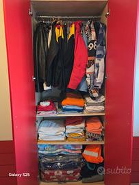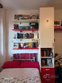Vendo camera completa di armadio grande con angolo scaffali più armadio a colonna, 6 mensole bianche e rosse e comodino. Misure: Mobile grosso 272 più mobile angolare 34 fondo 59 alto 227 Mobile sottile largo 45 profondo 56 alto 260 6 Mensole lunghe 100 profonde 29 Comodino 45×38 alto 54 Trasporto a carico vostro, disponibile in caso smontato se preferite Sesto Calende