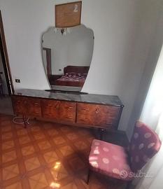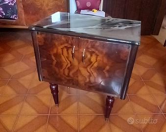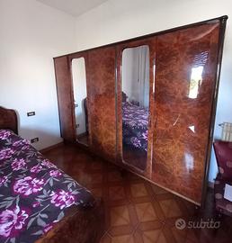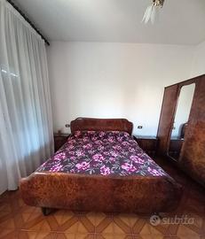 Camera matrimoniale in radica di noce anni 60' (da smontarsi in loco). Completa di : armadio, comó, comodini e rete con doghe in legno. Se interessati le due poltroncine e materasso sono in omaggio. N.B: il comó e i comodini hanno il piano in vetro.