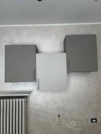 Composta da armadio a ponte e 3 pensili cubo con anta, bicolore grigio chiaro e grigio scuro.