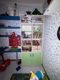 Camera per ragazzi, colore panna, verde e blu in ottimo stato. Completa di letto, comodino, armadio 8 ante, scrivania, libreria e mobile contenitore. Vendibile anche sconposta. Letto 200, armadio 400, scrivania 100, libreria 100, mobile contenitore 200. Smontaggio e ritiro a carico dell’acquirente