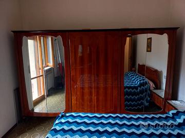 Elegante camera d'epoca completa, perfettamente conservata e pronta all'uso. La camera è composta da un letto matrimoniale, comodini abbinati e armadio in legno massello impellicciato e intarsiato, cassettone con piano in marmo e specchiera.