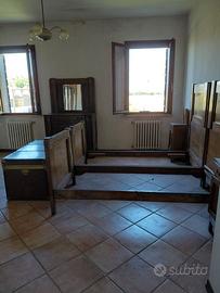 Camera da letto in legno completa con cassettone con specchiera, letto, due comodini, armadio(quello in foto)+armadio non con gli stessi decori, ma dello stesso colore, in regalo in quanto andrebbe fatto un trattamento antitarlo.