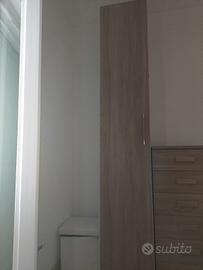 Camera da letto a ponte matrimoniale colore rovere chiaro, composta da 11 ante con cabina armadio angolare con inclusi all'interno appeso più mensola e 4 cassetti,più una parte tutta mensole. Comò , cassettiera e specchio. Led nel ponte incluso. Misure: lunghezza 5.10