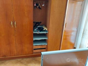 Camera da letto impiallicciata anni 50/60 composta da: •Armadio 5 ante con specchio e cassettiera centrale; •Comò 4 cassettoni con specchio; •Testata letto inglobante comodini con cassettino; •Rete a doghe lunghe usata pochissimo. Disponibili fotografie di dettaglio delle singole parti. SOLO ritiro, venduto con formula “Visto e piaciuto”, smontaggio e spedizione (e relative spese) NON inclusi, a carico dell’acquirente.