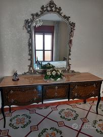 camera da letto anni 60 in legno lucido composta da armadio con 2 ante con specchio anteriore e 4 ante con all' interno divisori e 1 cassettiera a 4 scomparti , perfettamente conservata ; 1 como' composto da 4 cassetti grandi e 2 piccoli, sormontato da una bellissima specchiera argentata e con ripiano in marmo rosato perfetto ; 1 letto matrimoniale e 2 comodini di stessa essenza e con ripiani di marmo uguali al como ' . condizioni perfette