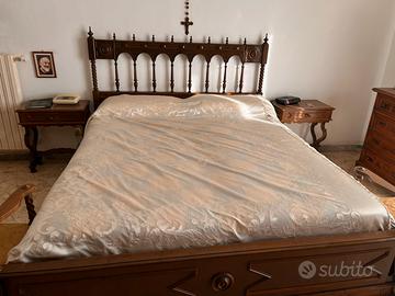 Realizzata in legno massello con finitura lucida, colonne tornite e decorazioni intagliate.