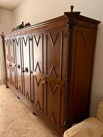 Elegante camera da letto artigianale italiana in stile classico, composta da armadio a sei ante, letto matrimoniale, comò con specchiera e due comodini.