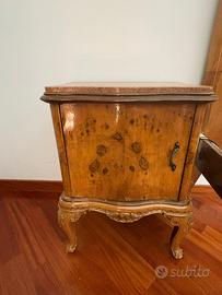 camera da letto costituita da: letto, armadio con specchio, 2 comodini, 1 cassettiera con specchio. In legno di radica con marmo.