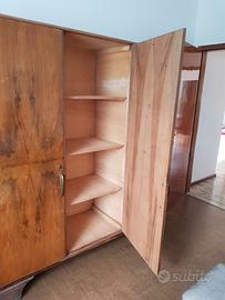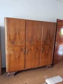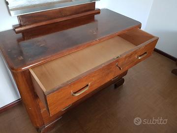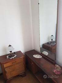 Vendo antica camera da letto matrimoniale in legno, completa dei seguenti componenti coordinati: mobile guardaroba, cassettiera con specchio, contorno letto con testiera, due comodini, due sedie e sgabello con stesso rivestimento, mobiletto con specchio, bajour. lo stato è molto buono se si considera che è una camera d'epoca. A disposizione per eventuali foto aggiuntive.