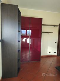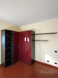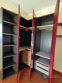 - Armadio angolare a 3 ante + colonna libreria completo di ripiani interni, barre appendiabiti, cassettiera piccola a 2 cassetti e cassettiera grande a 3 cassetti. Larghezza lato ante 110 cm, larghezza lato libreria 95 cm, profondità 60 cm, altezza 225 cm