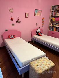 Vendo cameretta MORETTI per bambine dotata di due letti (giroletto + materassi), armadio, libreria e due mensole ad angolo. Colore rosa e lilla.