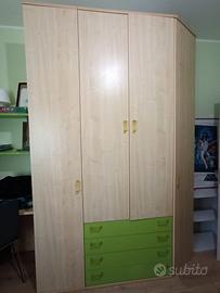 Armadio laterale, cassettiera, scrivania, mensole, cassetti scrivania, ulteriore armadio con due ante centrali e due laterali + cassetti.