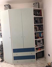 Camera da letto completa di letto contenitore e tessile, doppia libreria, armadio, scrivania con sedia girevole.