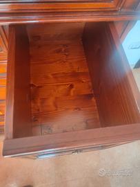 Comò con tanti cassetti con intreccio a coda di rondine, due comodini con le stesse caratteristiche e per finire la struttura del letto con le sue lavorazioni ad intarsi che la rendono particolare.