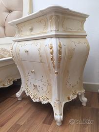 Camera da letto barocco, bombata, con intagli su vero legno, decorazioni manuali e dettagli in oro vera foglia realizzati a mano.