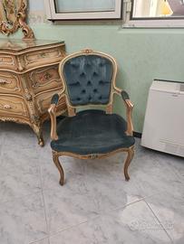 Camera da letto in stile barocco veneziano, caratterizzata da mobili artigianali finemente decorati con intagli floreali e finiture dorate. L’ambiente è impreziosito da un grande armadio dipinto a mano, una cassettiera bombata con specchiera coordinata e un letto con testiera scolpita. I toni pastello delle pareti e degli arredi creano un’atmosfera raffinata e romantica, ideale per chi ama gli interni classici e ricercati