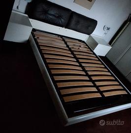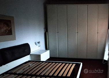 camera da letto composta da armadio stagionale bianco, letto con rete a doghe legno, comodini a giro letto. Testata in ecopelle un po usurata, ma lucidabile.
