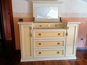 Camera da letto matrimoniale composta da: letto in ferro battuto, completo di rete e materasso; armadio a 6 ante con specchio e cassettiera all’interno; Como’ con ribalta; 2 comodini con 3 cassetti.