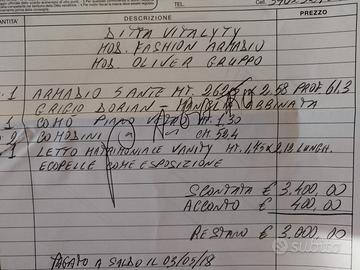 vendesi camera da letto completa,acquistata presso il mobilificio "creo",con fattura dimostrabile in foto. Armadio con apertura a gola, letto contenitore,2 comodini e 1 comò, tutto in perfette condizioni.Se interessati,contattare il numero:340 12 17 957.