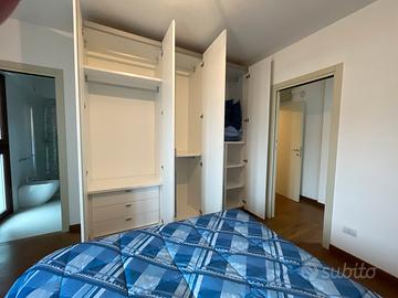 Letto matrimoniale (175x240 cm) con rete a doghe (160x200cm) e materasso. Struttura con contenitore ad apertura frontale.