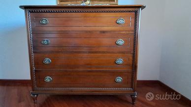 Elegante camera da letto in stile classico arte povera composta da: - Cassettiera 4 cassetti 130x50 cm h. 110 colore noce caldo con maniglie ottone decorato; - 2 comodini in legno.
