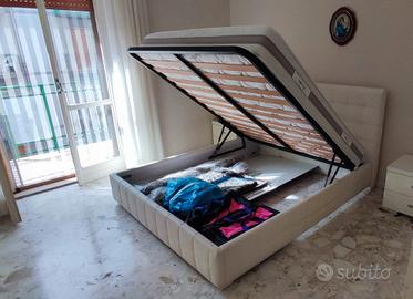completa di letto matrimoniale a cassettone contenitore con rete ortopedica doghe in legno tutto funzionante con pistoni mollettoni sani il letto funziona e rimane alzato per un ottima pulizia, testiera e contorno letto in pelle bianca