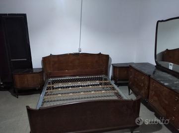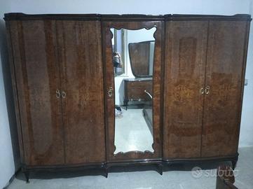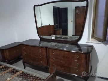 Vendo camera da letto completa originale anni ’60 appartenuta a mia nonna, in ottimo stato di conservazione. vendibile anche separatamente I mobili sono in legno di radica con lavorazioni e dettagli tipici del periodo, con piano in marmo e specchi originali. La camera comprende: Armadio a 5 ante con specchio centrale Comò con specchiera Coppia di comodini Toilette con specchiera Letto matrimoniale con testiera e pediera in radica Stile elegante e senza tempo, ideale sia per arredare con gusto vintage sia per chi cerca pezzi d’antiquariato di qualità. Smontaggio e trasporto a carico dell’acquirente. Visibile su appuntamento.
