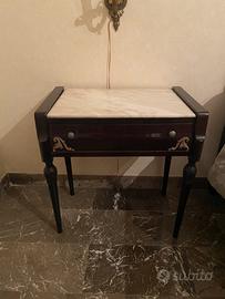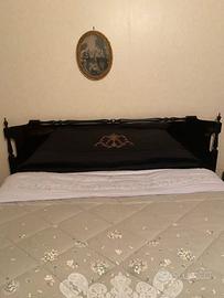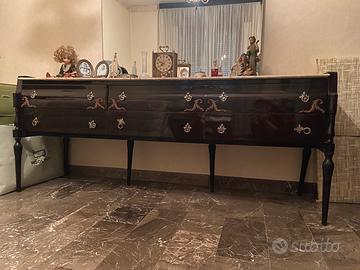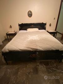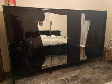 Vendesi camera da letto completa degli anni '60. Il set è caratterizzato da una finitura lucida scura. Il set comprende: • Armadio a 6 ante con specchi sagomati (1,90m x 1,73m x 0,63 m di profondità). Interno in buono stato; struttura e vernice esterna ben conservate, decori sulle ante mancanti • Comò con piano in marmo e grande specchiera sagomata con decoro superiore (1,85m x 0,76m x 0,52 m di profondità) • Coppia di Comodini coordinati (0,58m x 0,55 x 0,35 m di profondità) • Letto matrimoniale: Testiera sagomata con inserti decorativi coordinati al resto del set (1,90m x 1,60m)