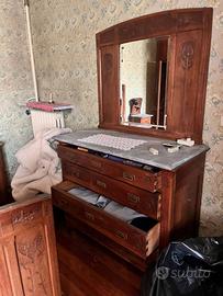 Vendo camera da letto d’epoca stile Liberty (primi 1900), realizzata completamente in legno massello con tipici intagli floreali dell’epoca e piani in marmo originale.