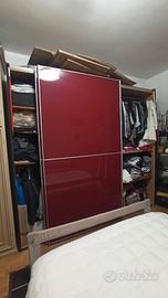 Camera da letto composta da : letto matrimoniale struttura e doghe escluso materasso, 2 comodini, 1como e 1 specchio e armadio con ante scorrevoli fianchi marrone scuro come il resto dell'arredo e scorrevoli bordò. (Si segnala che le ante scorrevoli dell'armadio avrebbero bisogno di manutenzione perché tendono ad incastrarsi, ma tirando verso di se funzionano)