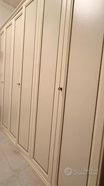 Vendesi splendido coordinato per camera da letto composto da armadio a 6 ante, comò bombato e comodini. I mobili presentano una raffinata finitura bianco crema con linee sinuose e gambe a sciabola.