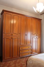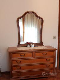 I mobili sono caratterizzati da una struttura molto solida, cornici sagomate e ferramenta originale in metallo brunito. Tutto è stato conservato con estrema cura. Dimensioni e pezzi inclusi: Armadio a 6 ante dotato di 3 ampi cassetti esterni centrali e grande capacità contenitiva 280 cm x 60 cm, h 255 cm Comò (cassettiera) con 4 cassetti spaziosi con maniglie lavorate 130 cm x 52 cm, h 80 cm Specchiera sagomata 77 cm x 100 cm (nel punto di massima larghezza/altezza) 2 comodini con 3 cassetti ciascuno 57 cm x 37 cm, h 55 cm Letto matrimoniale con testata e pediera coordinate (per materasso standard da 180x190 cm), include rete in maglia di ferro. Materasso non incluso. Stato dell'oggetto: I mobili sono in ottime condizioni generali, pronti all'uso. Ideali per arredare case padronali, seconde case o per amanti del mobile tradizionale di qualità. Condizioni di vendita: Prezzo: € 700 (trattabili se interessati al set completo), smontaggio e trasporto a carico dell'acquirente. Località: Salgareda (TV) Disponibile da maggio