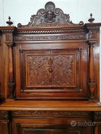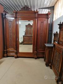 Lavorazione artigianale con intagli a mano, cimasa di armadio e specchiera con volto finemente intagliato.