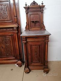 Due comodini con 1 cassetto e 1 portina, gambe sagomate e decori scolpiti. Rialzo porta candela. Piano in marmo. Dim. 51x41 h 146 cm.